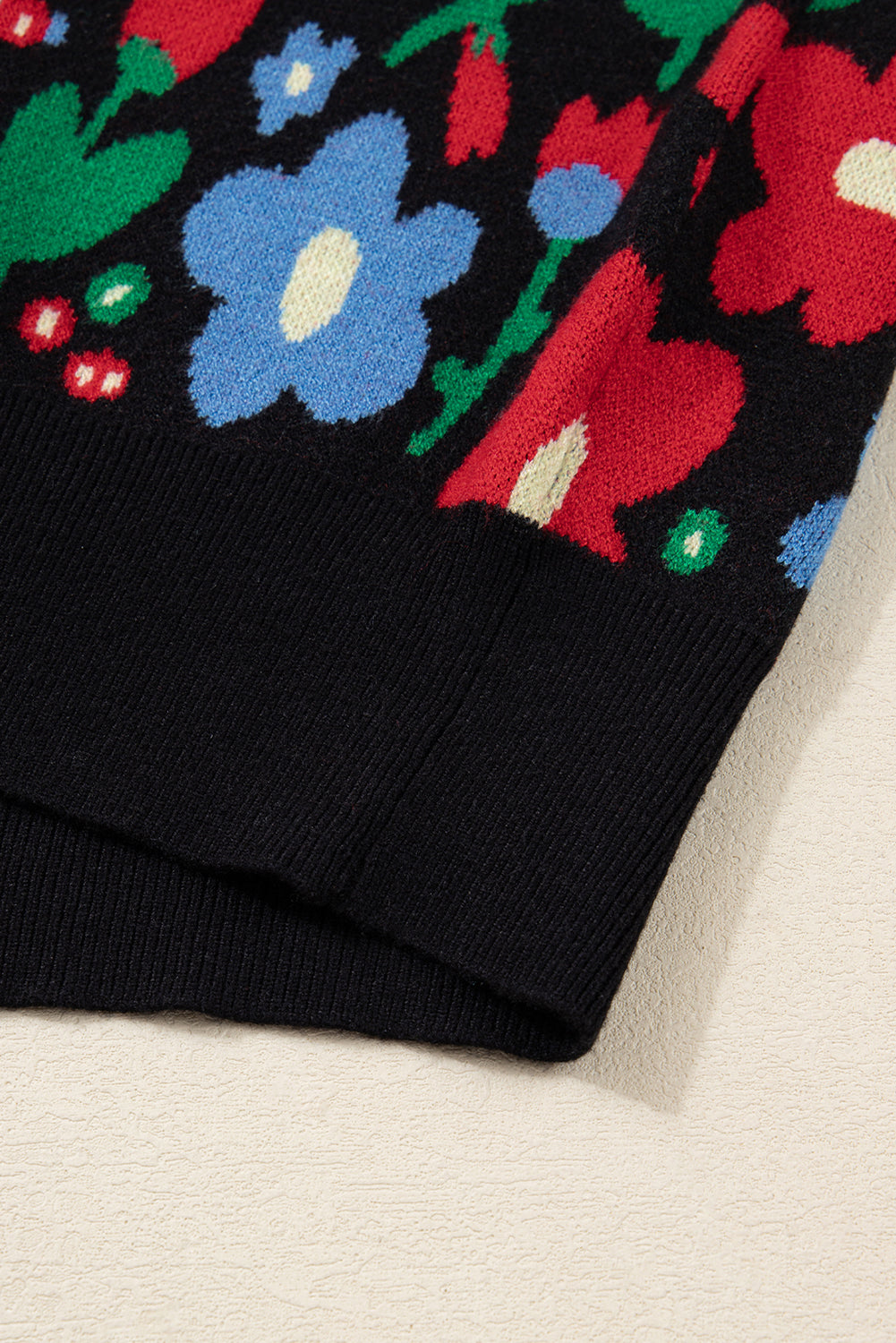 Black Floral Print V Neck Buttoned Short Cardigan Sweater