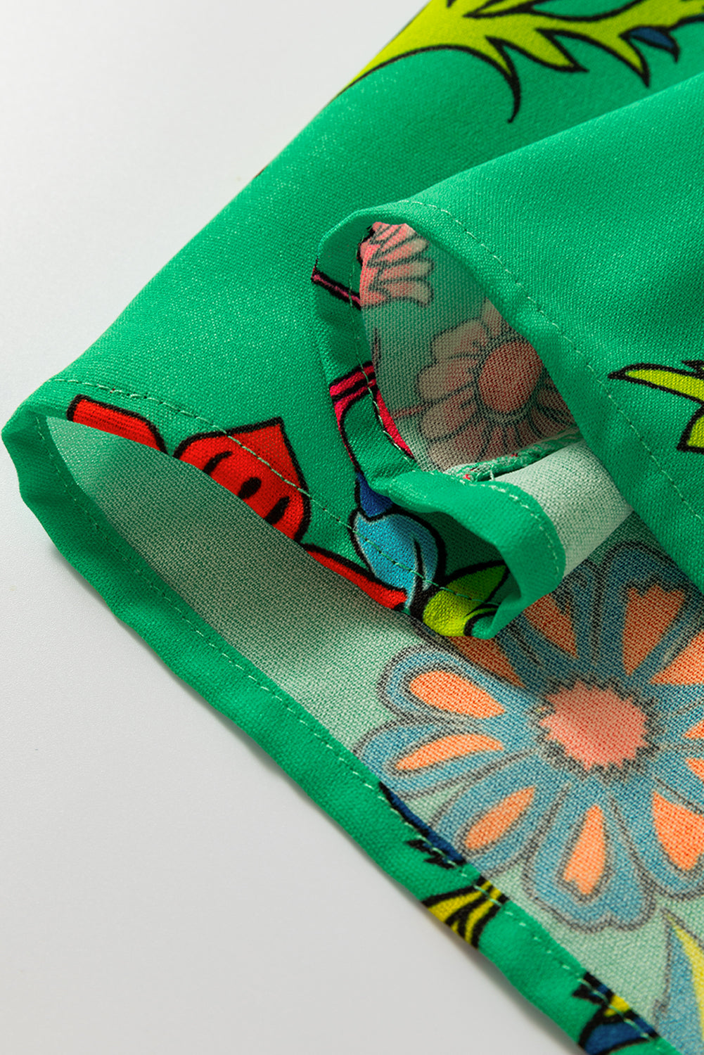 Green Floral Print Flutter Sleeve Frilly Neck Blouse
