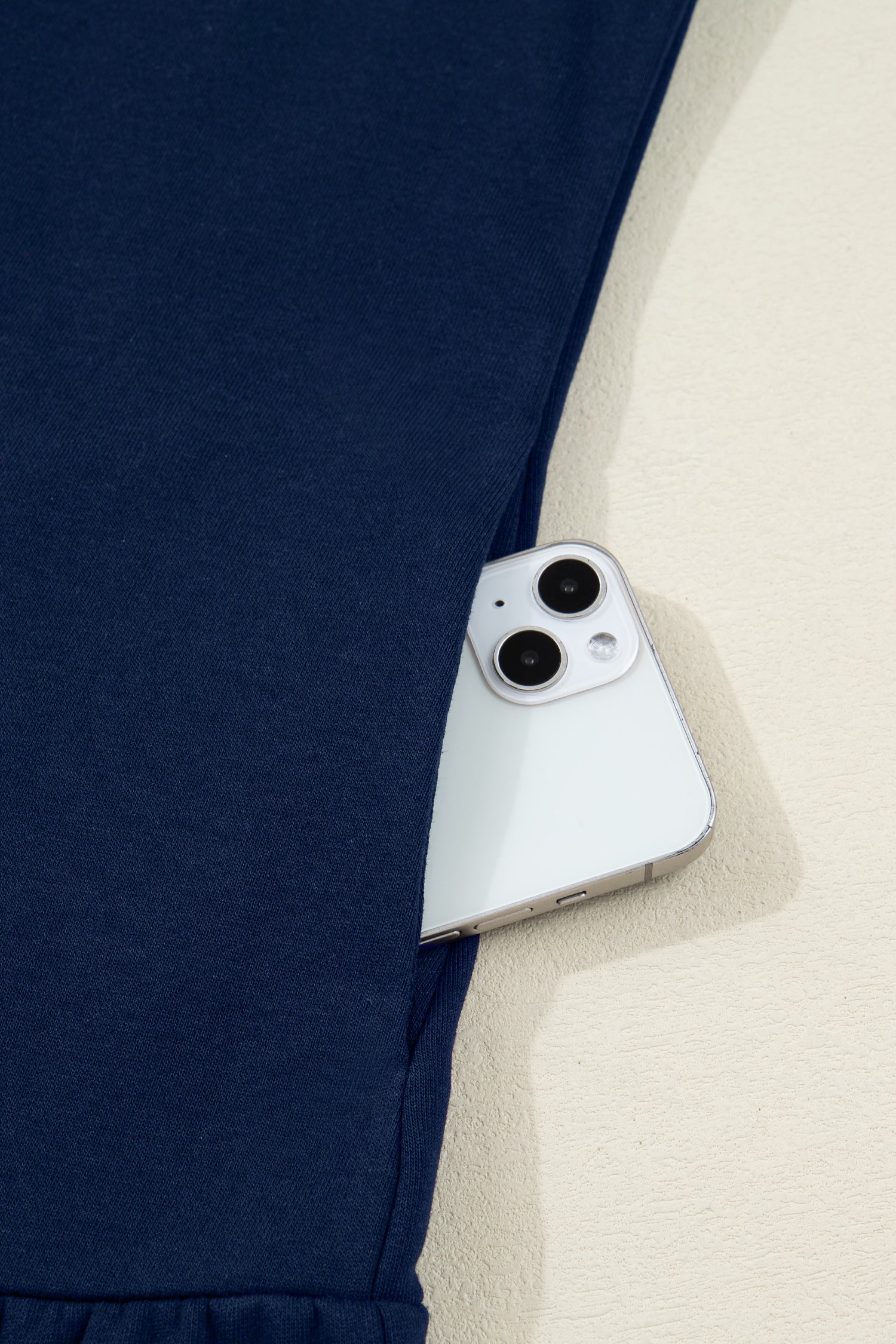 Navy Blue Contrast Striped Cuffs Polo Collar Patchwork Long Sleeve Ruffle Hem Mini Dress
