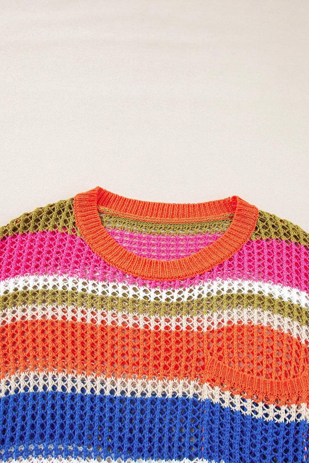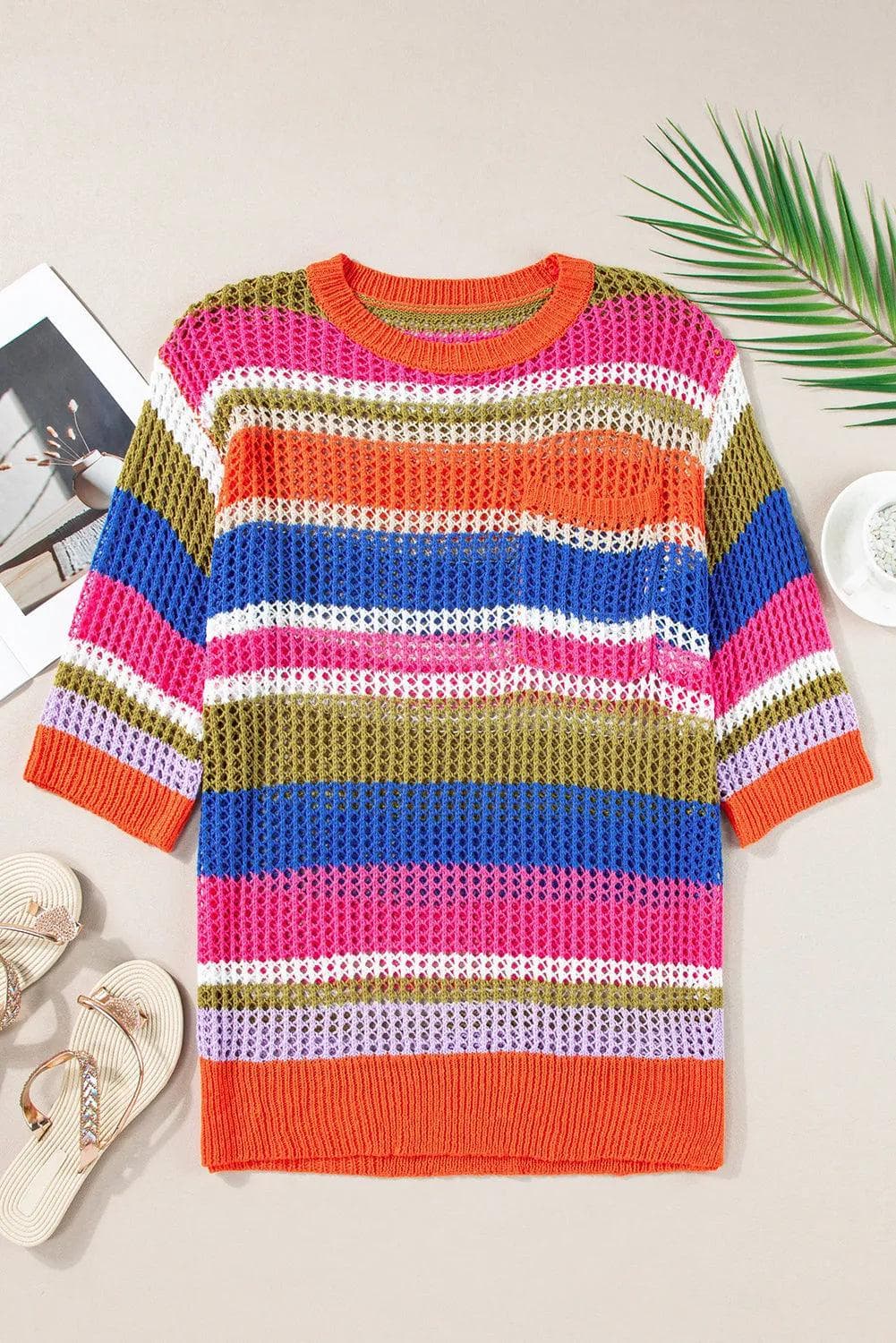 Orange Stripe Colorblock Hollowed Crochet 3/4 Sleeve Sweater