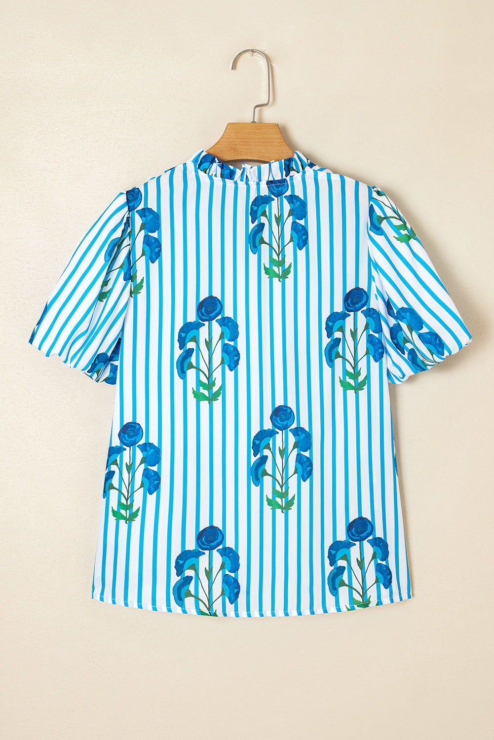 Sky Blue Stripe Floral Buttoned Frilly Notched Neck Puff Sleeve Summer Blouse