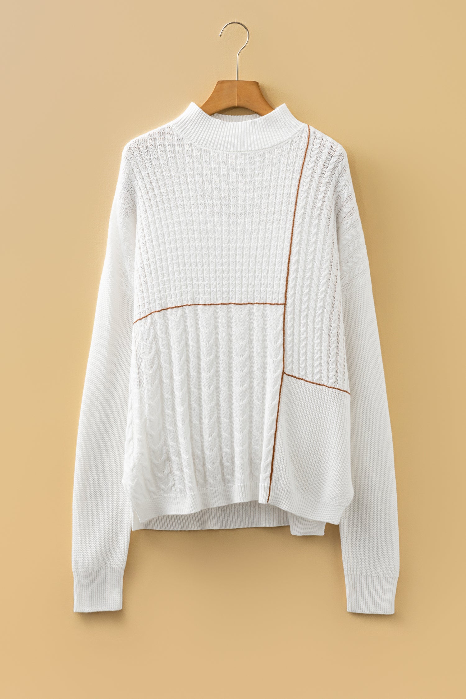 White Mix Texture Patchwork Contrast Stitch Mock Neck Sweater