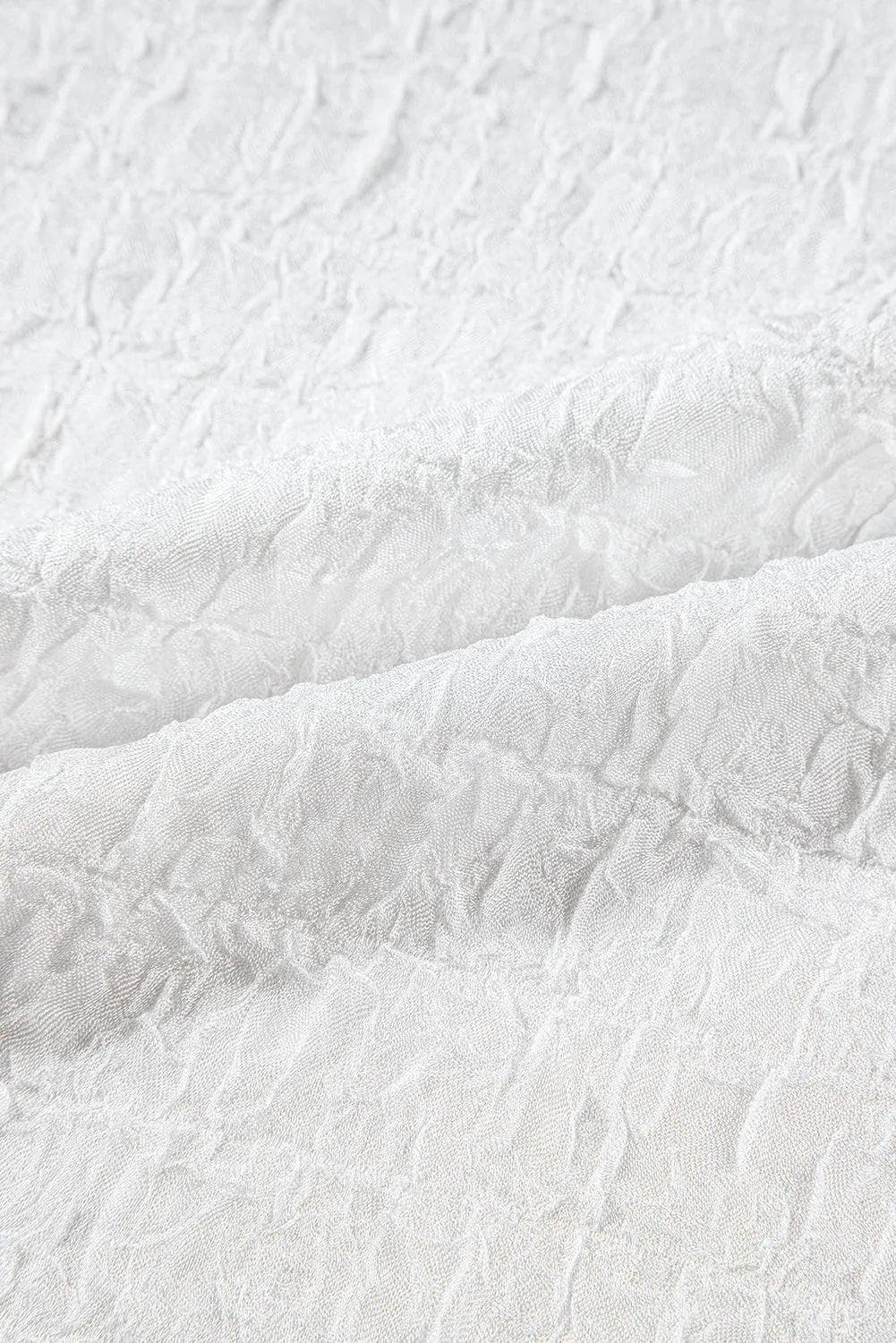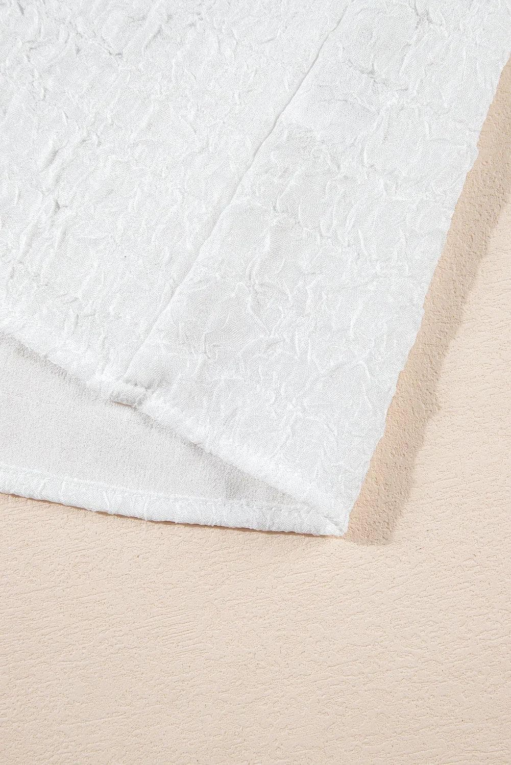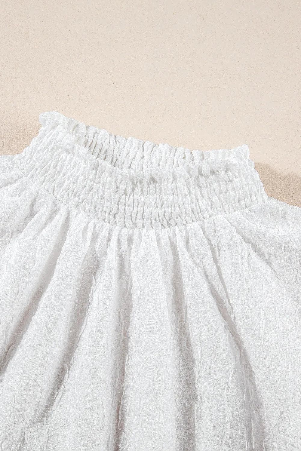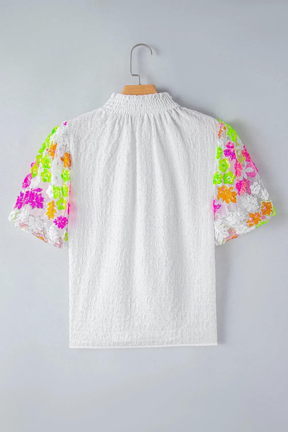 White Smocked Collar Sequin Flower Puff Sleeve Textured Top