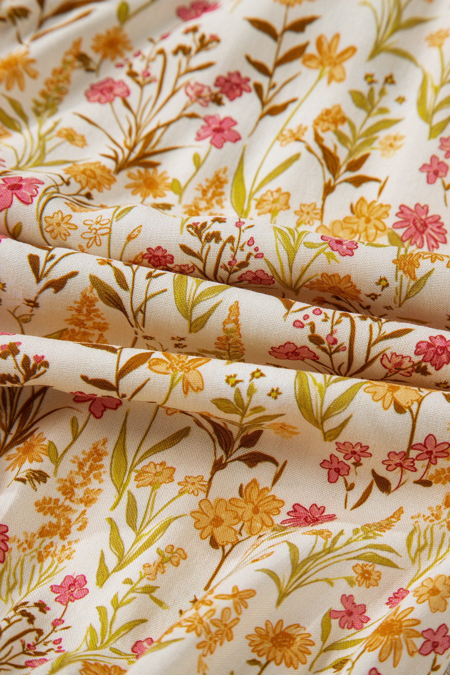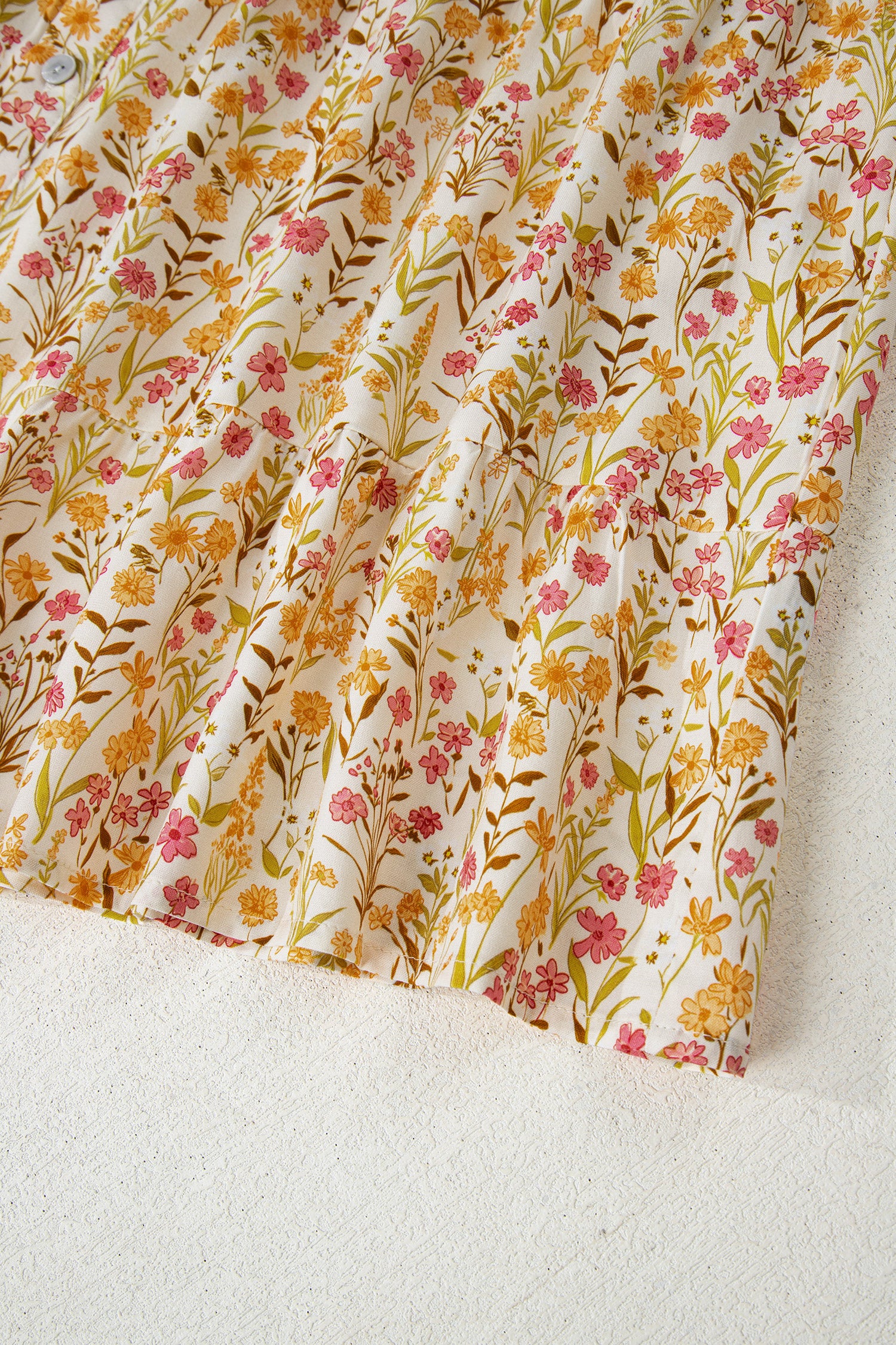 Yellow Floral Print Frilly Trim Smocked Cuff Long Sleeve Loose Shirt Dress
