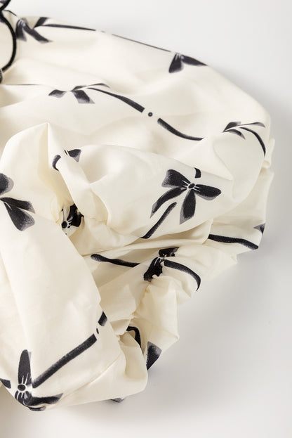 Apricot Bow Printed Ruffled Bubble Sleeve Lace-up Notched Neck Plus Size Blouse