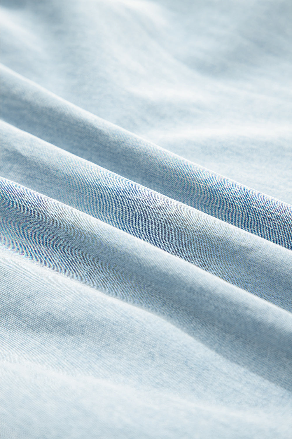 Sleeveless design and chambray fabric offer a light, breezy feel.