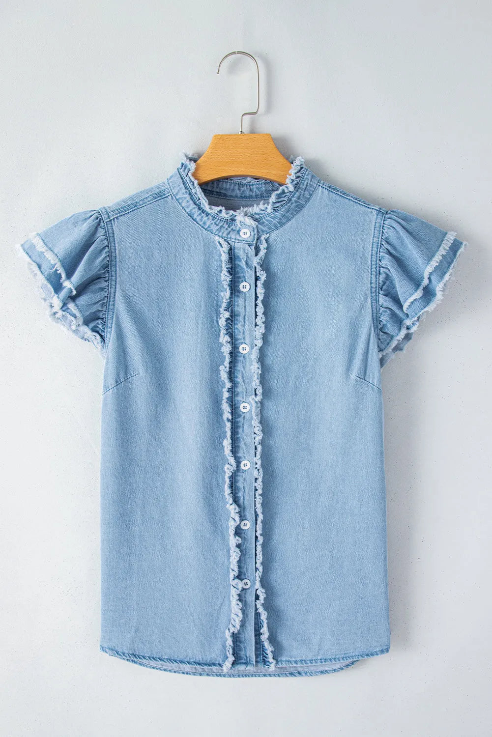 Beau Blue Button Front Ruffled Flutter Frayed Denim Top