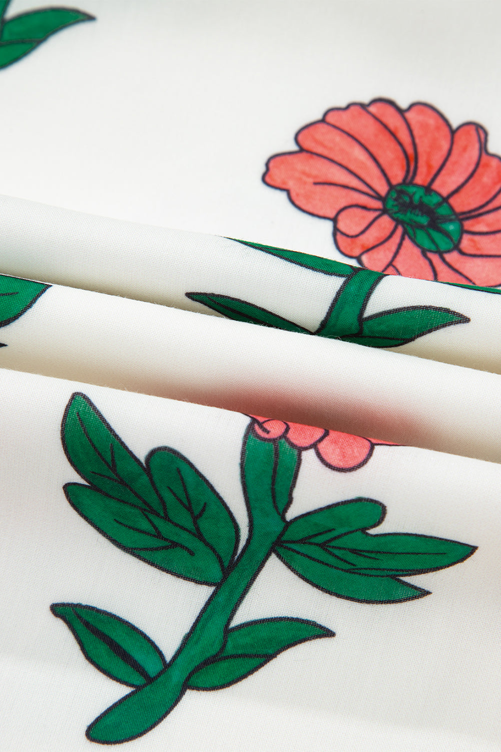Beige Floral Print Shirred Split Neck Short Sleeve Blouse