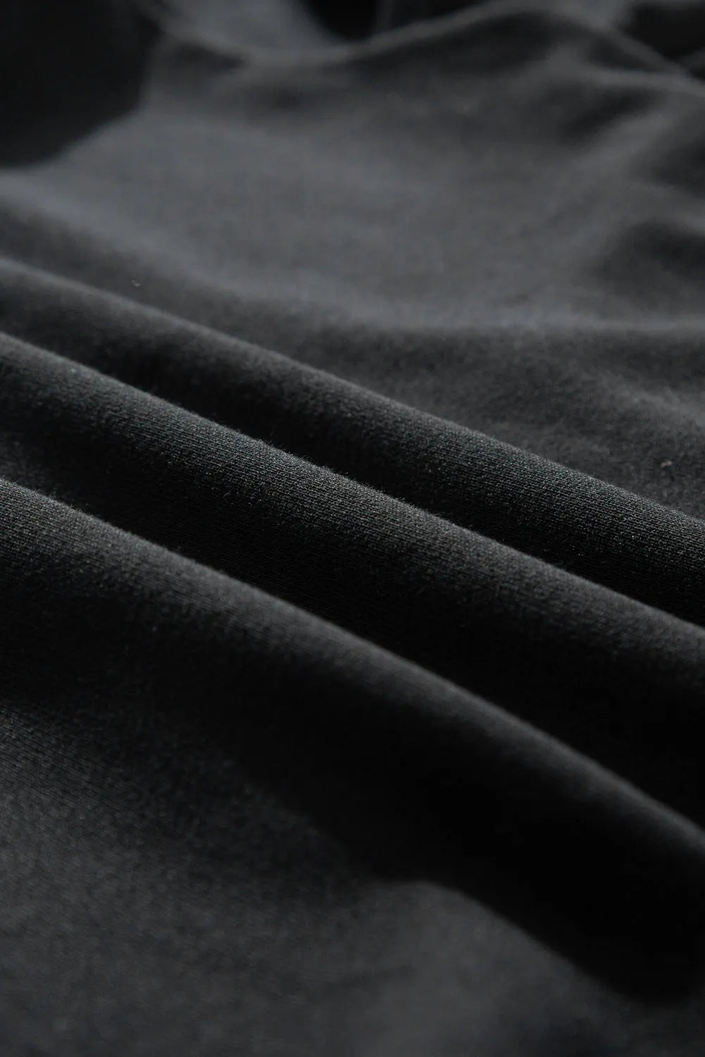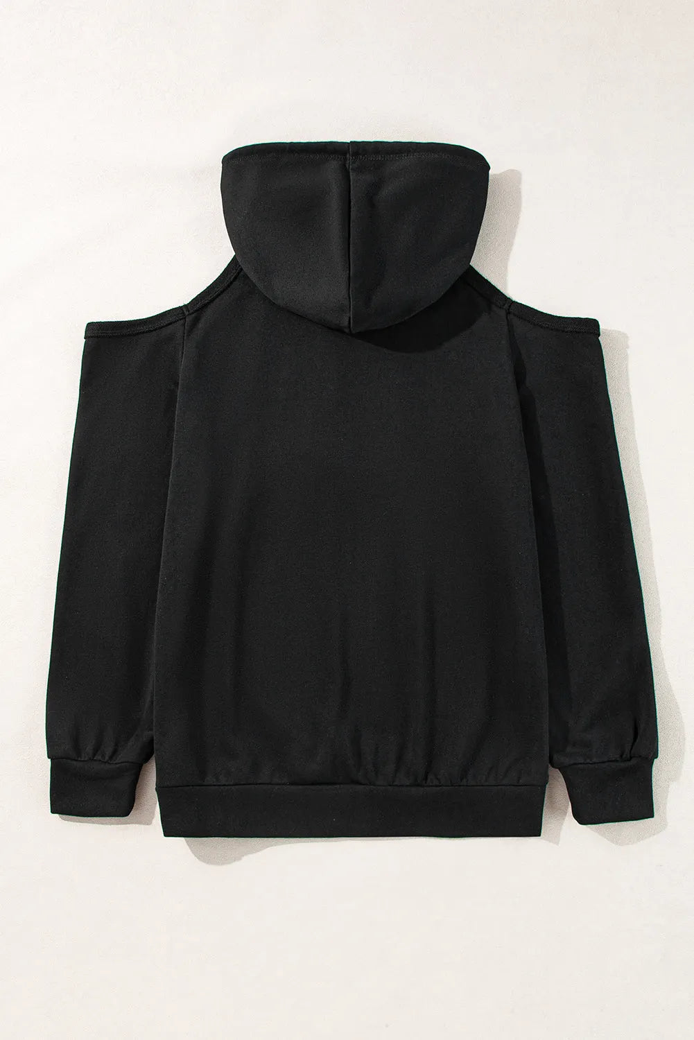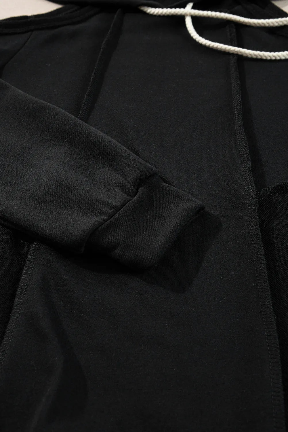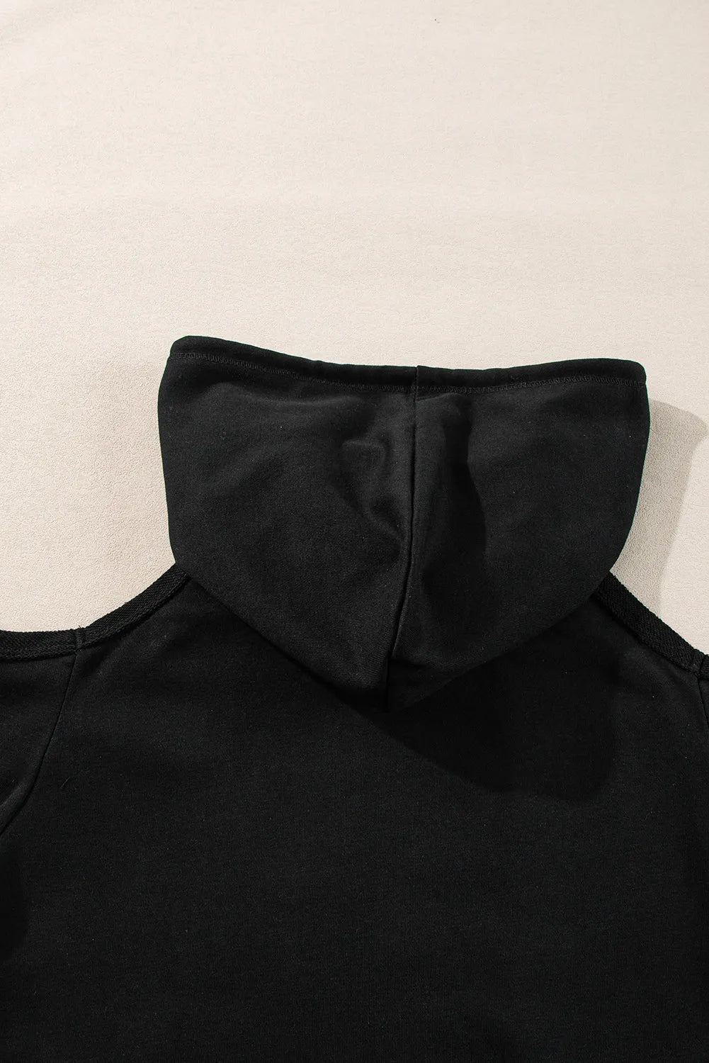 Black Exposed Seam Cold Shoulder Drawstring Hoodie