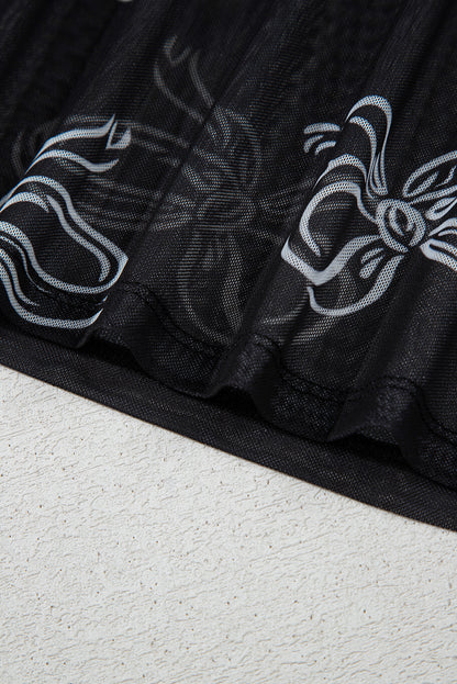 Black Round Neck Bow Print Long Sleeve Mesh Top