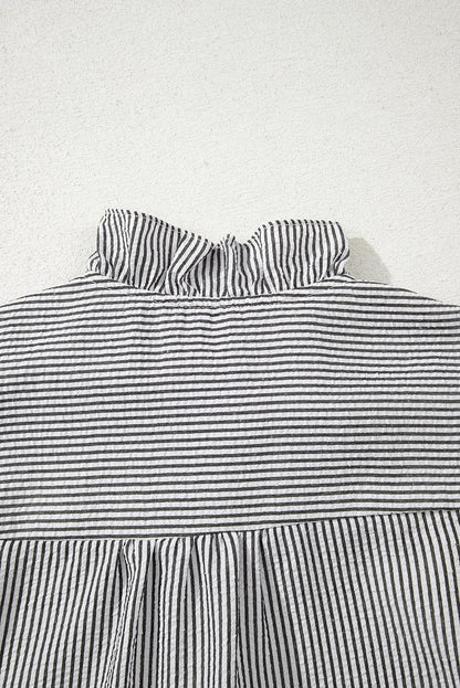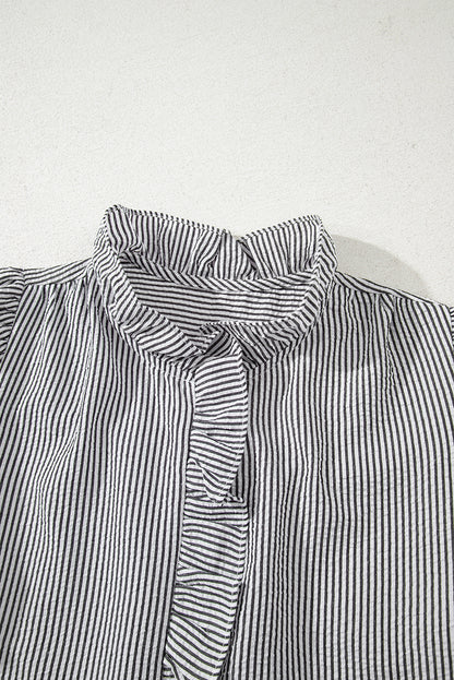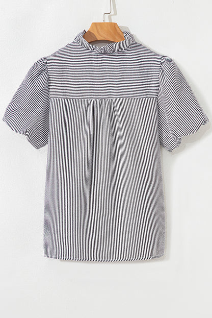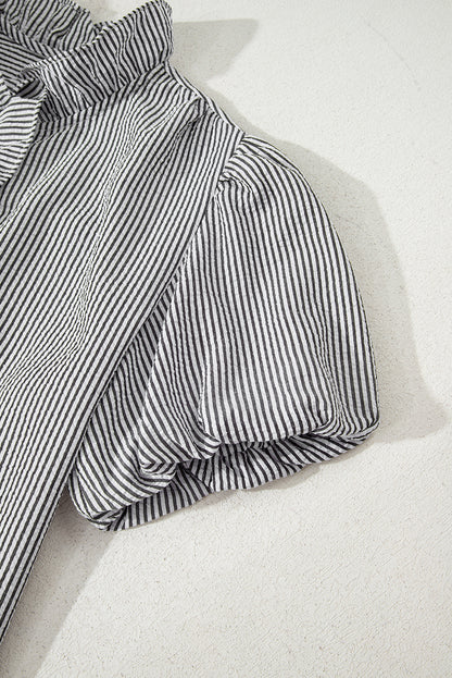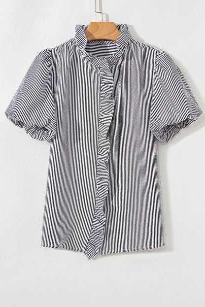 Black Striped Ruffle Short Bubble Sleeve Shirt