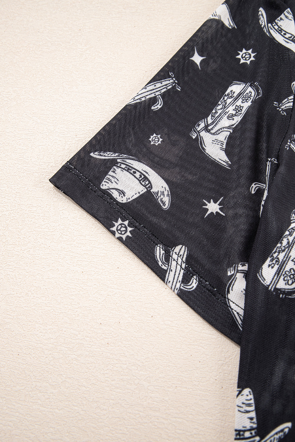Black Western Pattern Mesh Sheer Crew Neck T Shirt