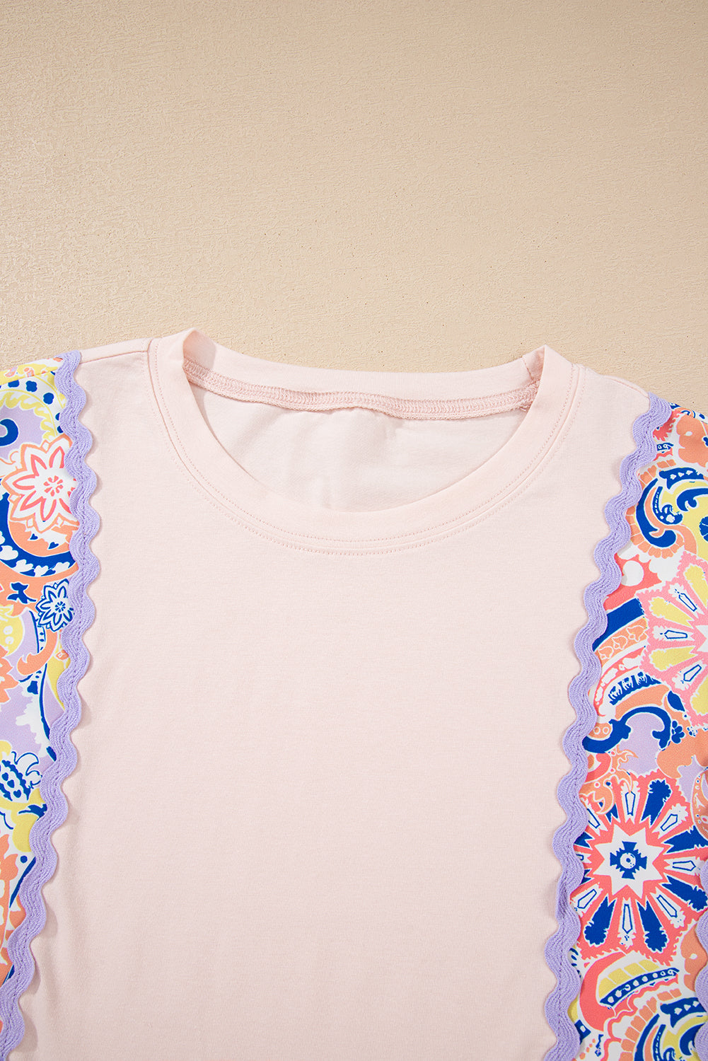 Delicacy Ricrac Trim Floral Plaid Patchwork Puff Sleeve Blouse
