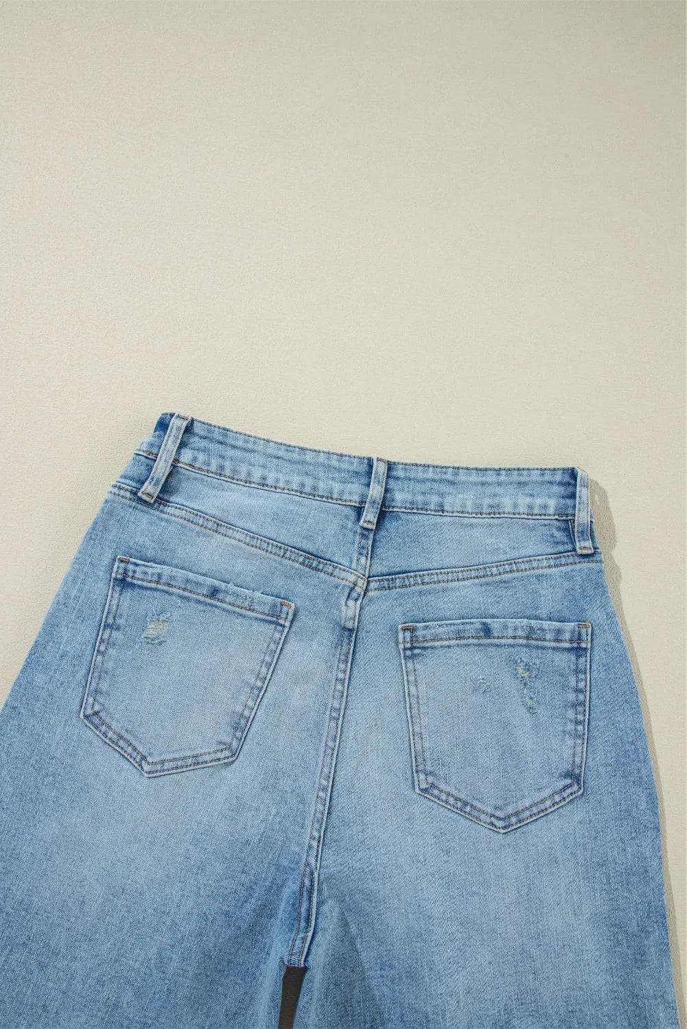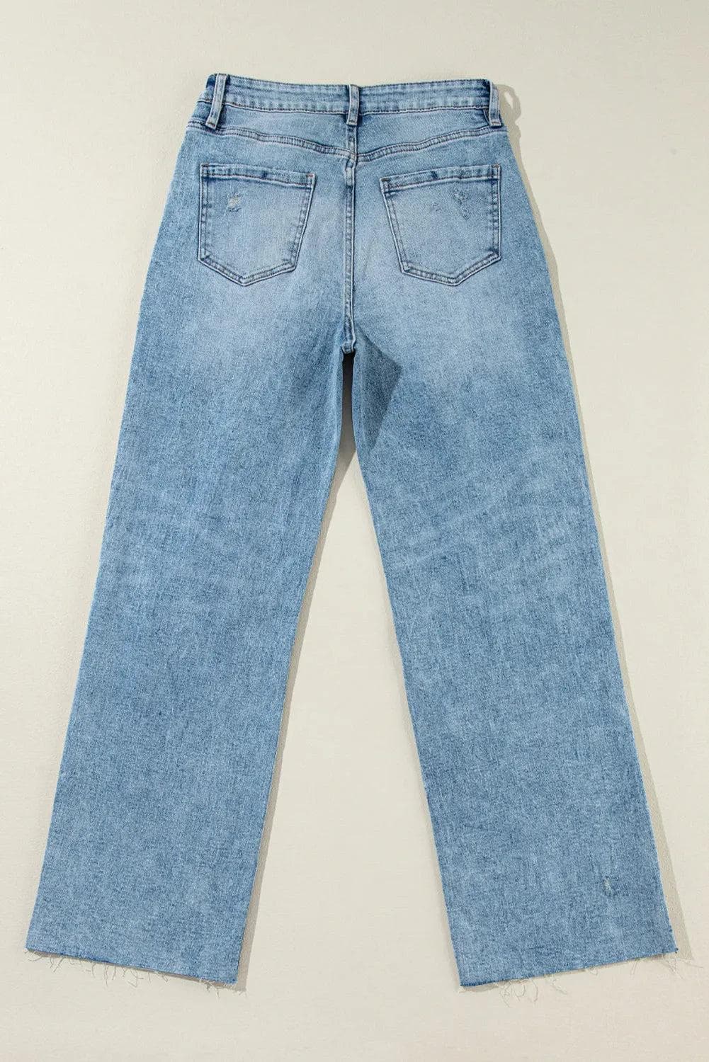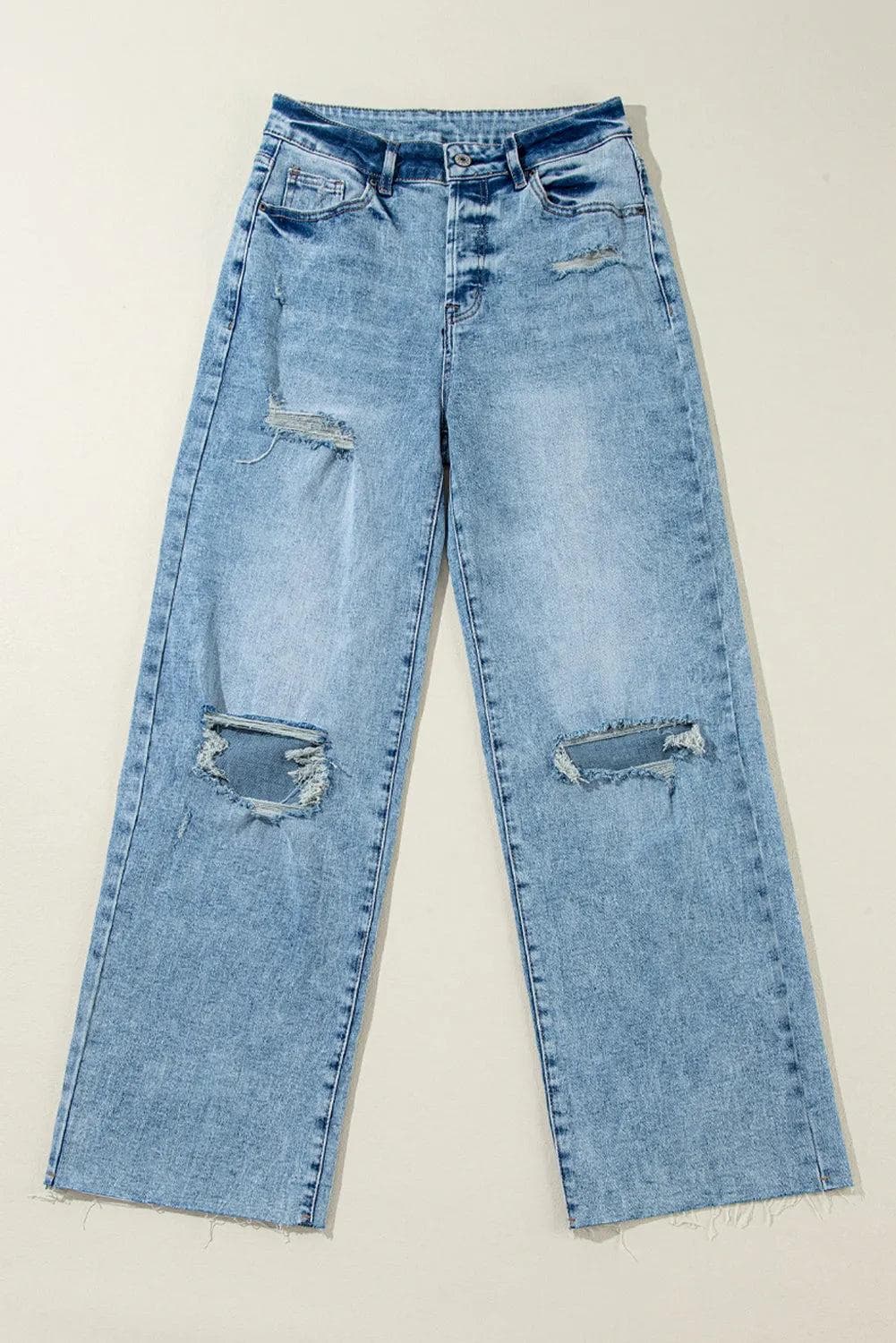 Light Blue Distressed Ripped Raw Hem Straight Jeans