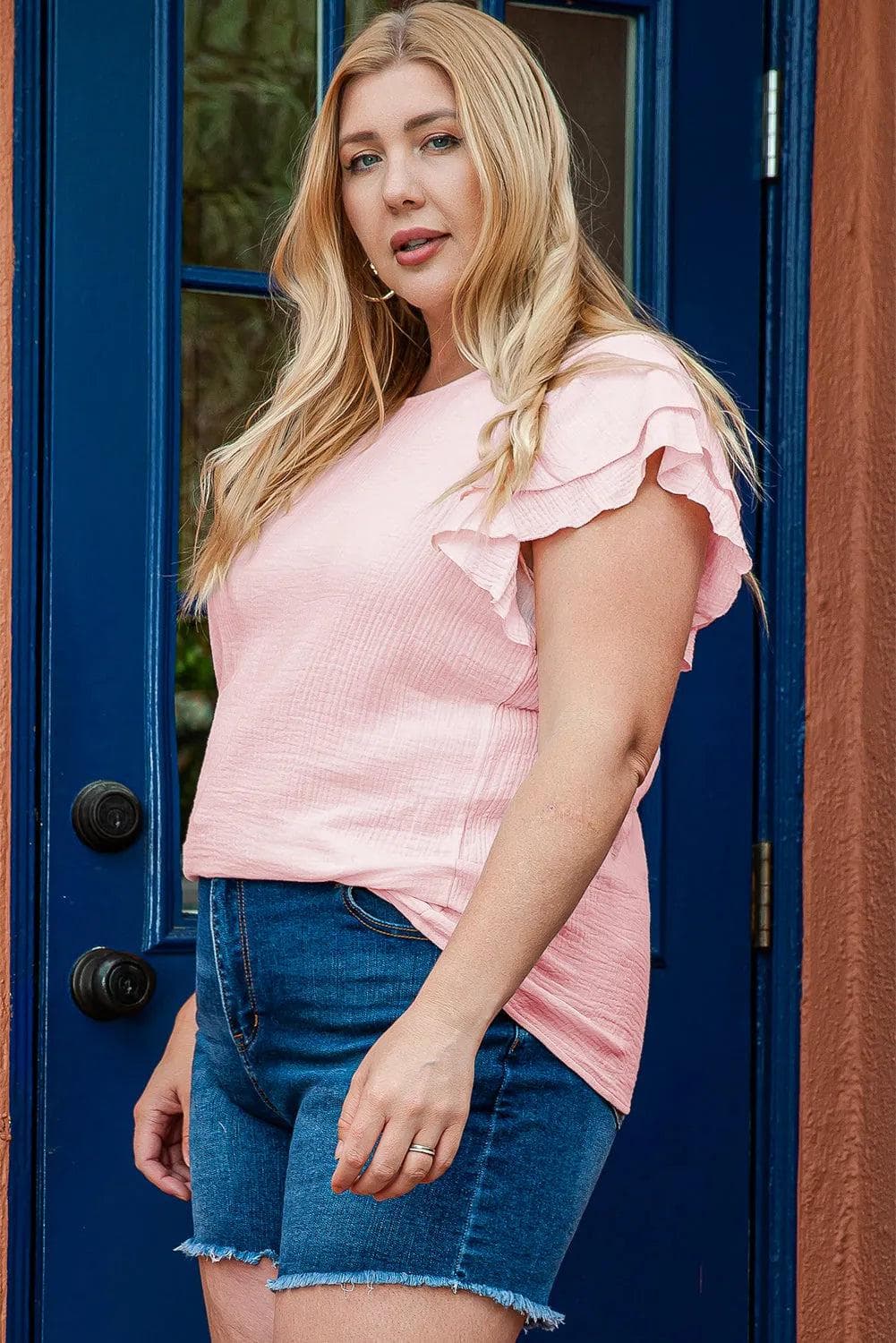 Light Pink Plus Size Crinkle Textured Ruffle Sleeve Top