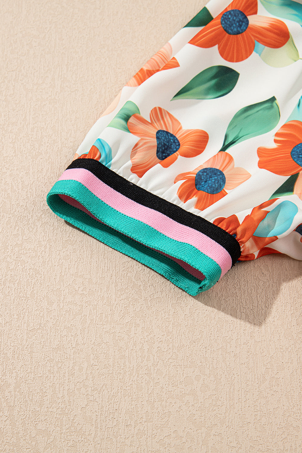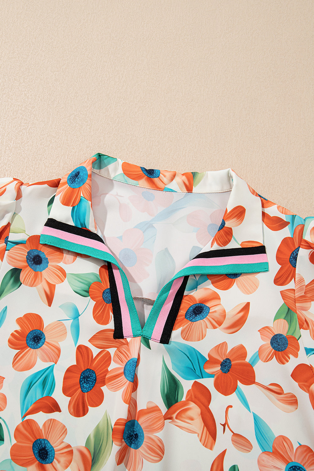 Orange Contrast Trim Floral Split Neck Puff Short Sleeve Tiered Mini Dress