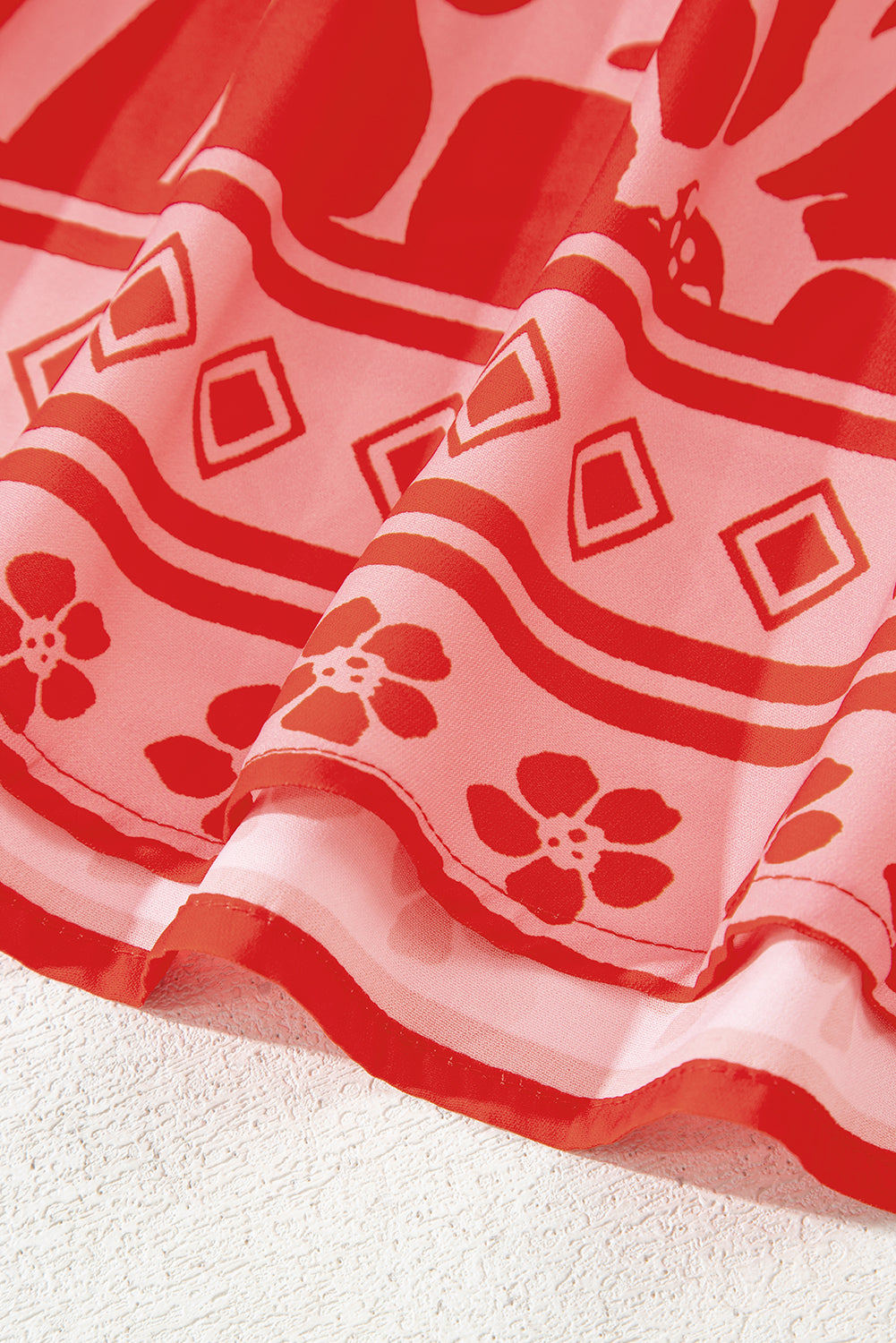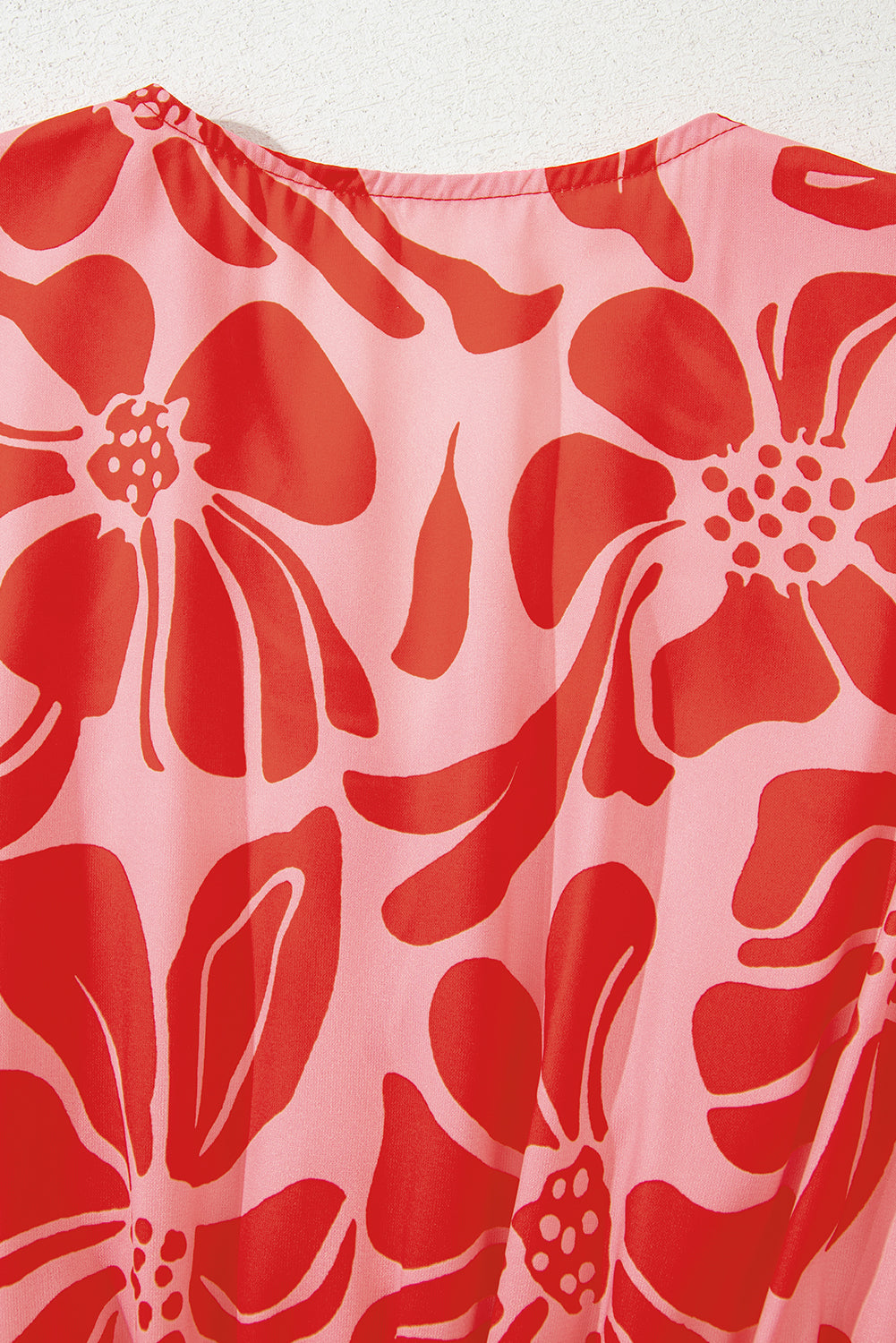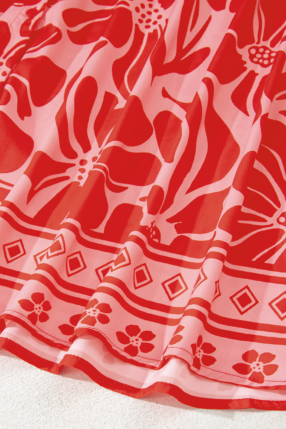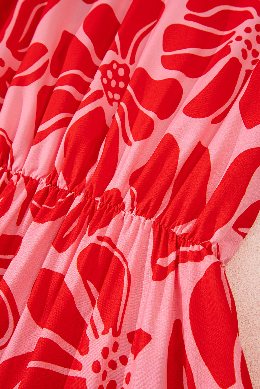 Red Boho Floral Short Sleeve V Neck Buttoned Shirred Waist Long Dress