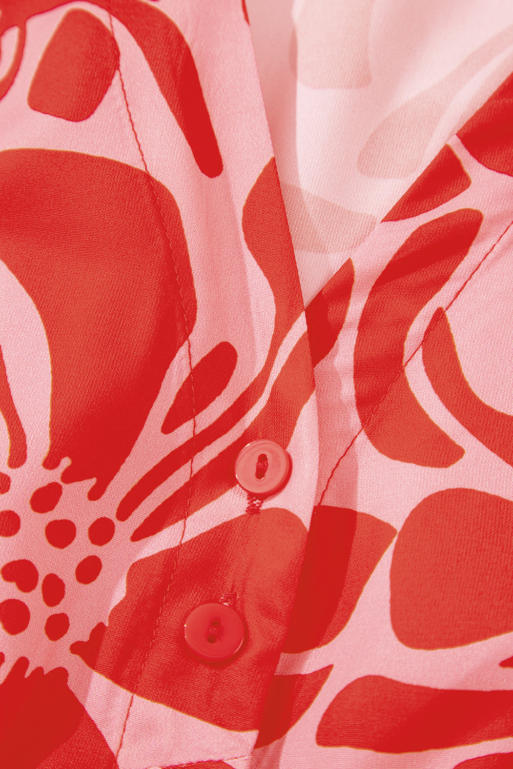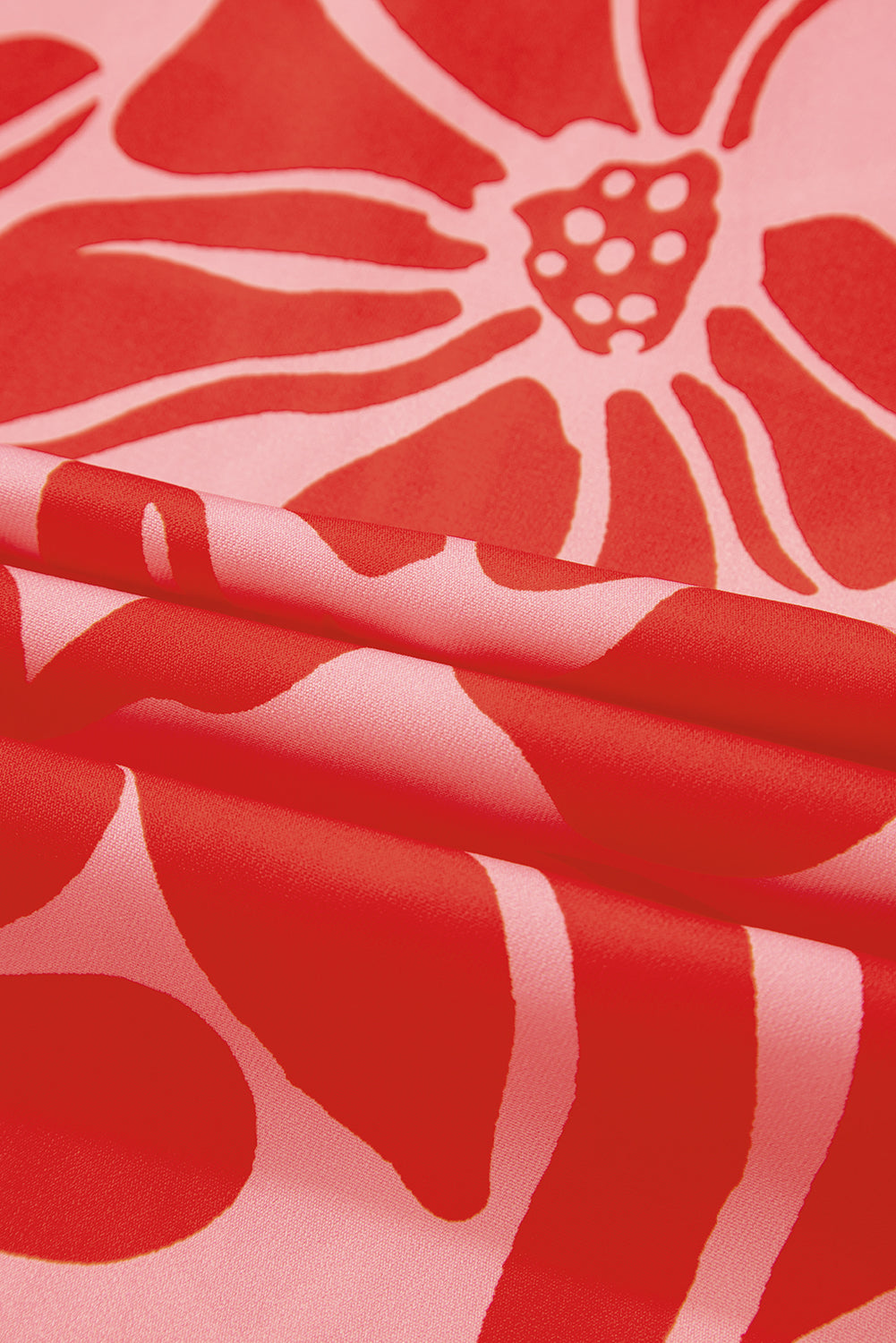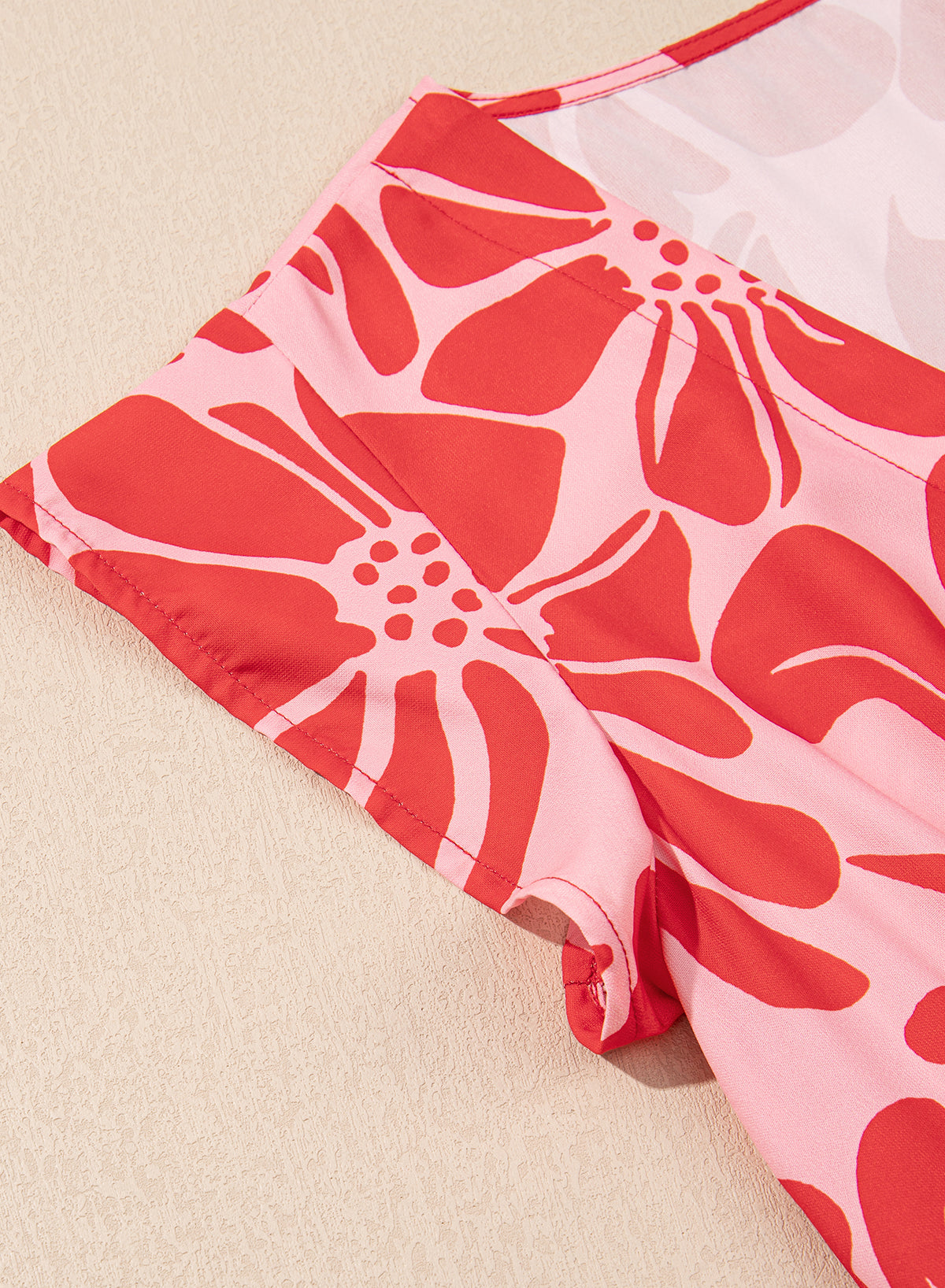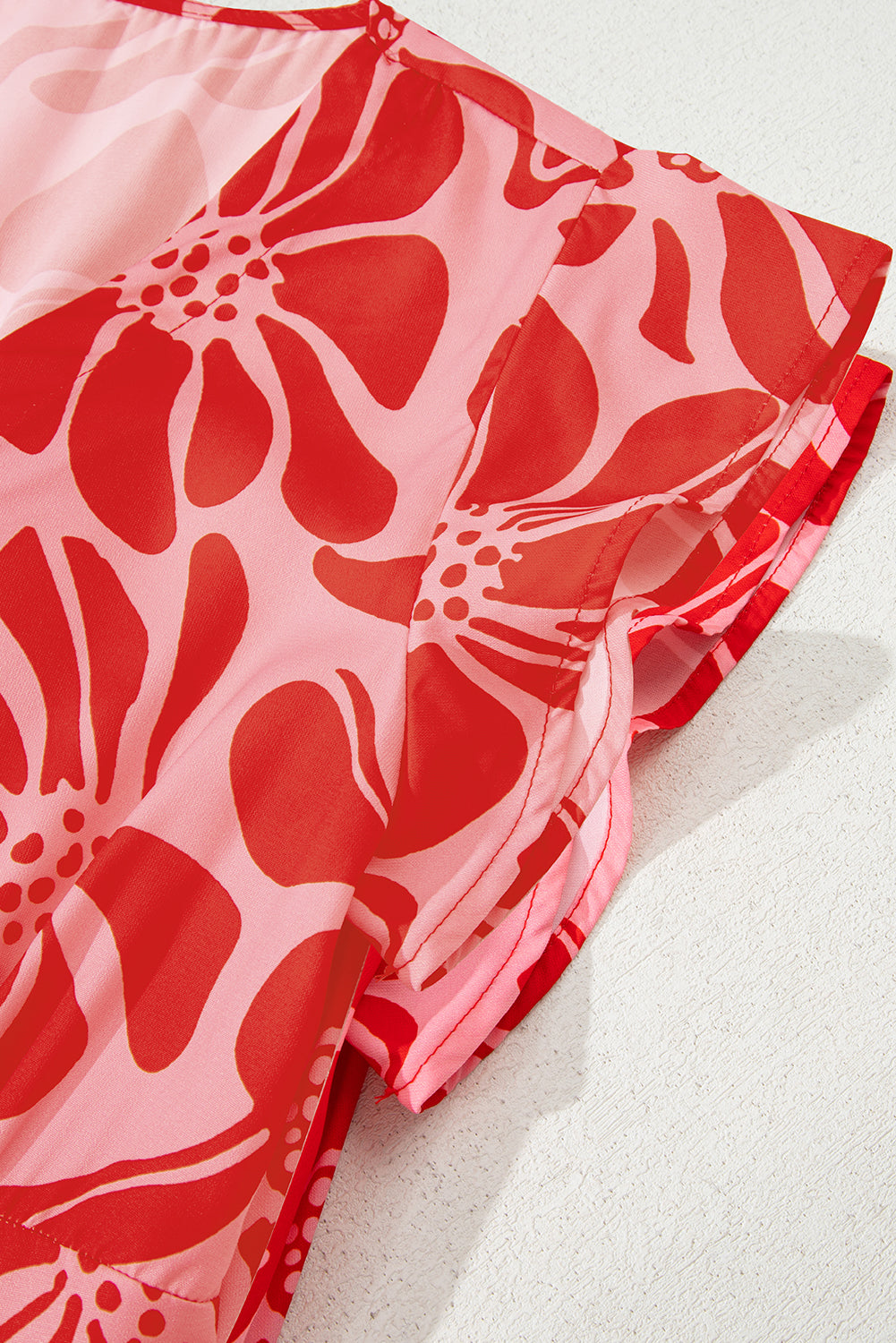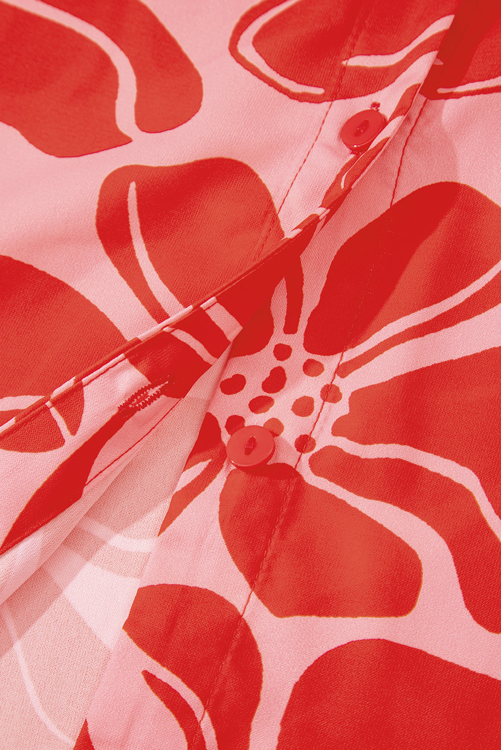 Red Boho Floral Short Sleeve V Neck Buttoned Shirred Waist Long Dress