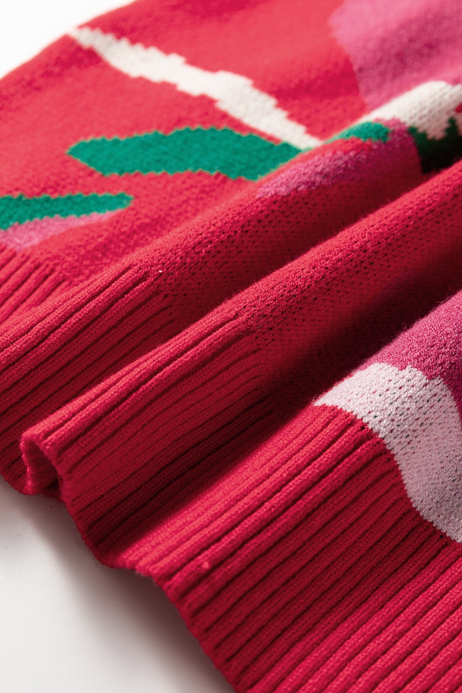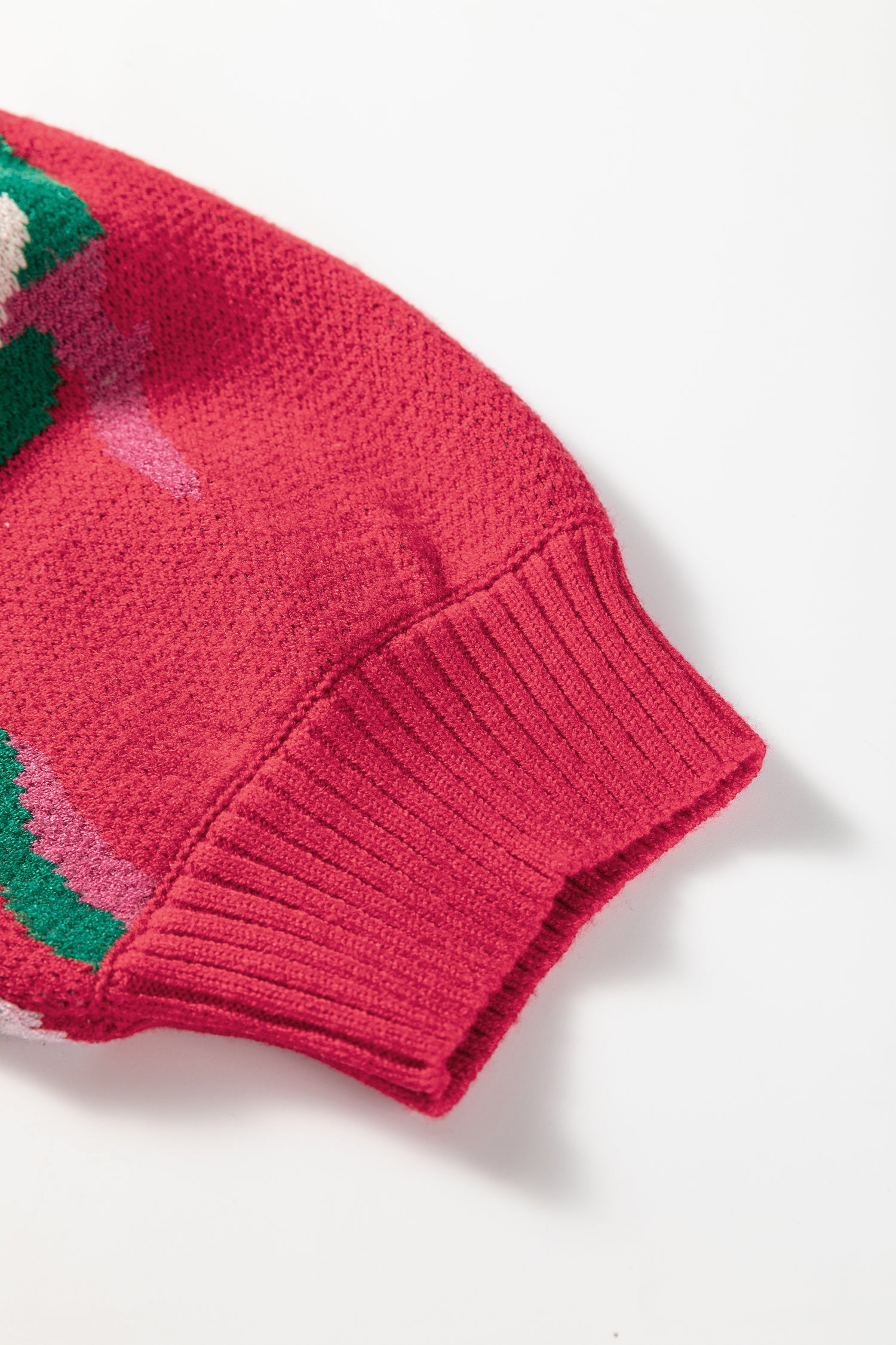 Red Floral Abstract Print Short Puff Sleeve Sweater