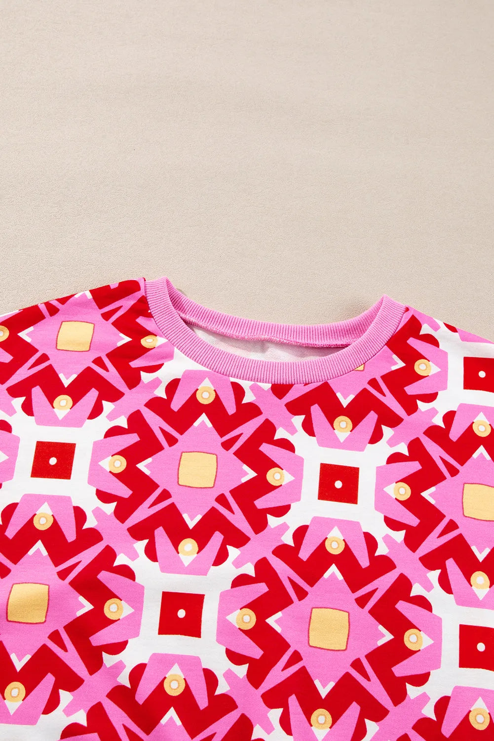 Sachet Pink Geometric Print Long Sleeve Top and Drawstring Shorts Set