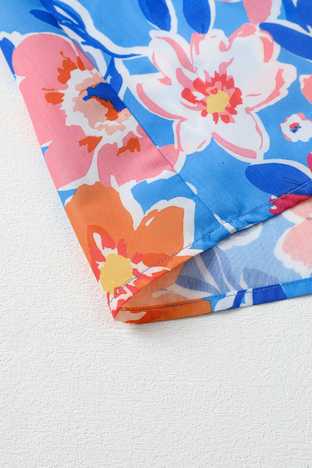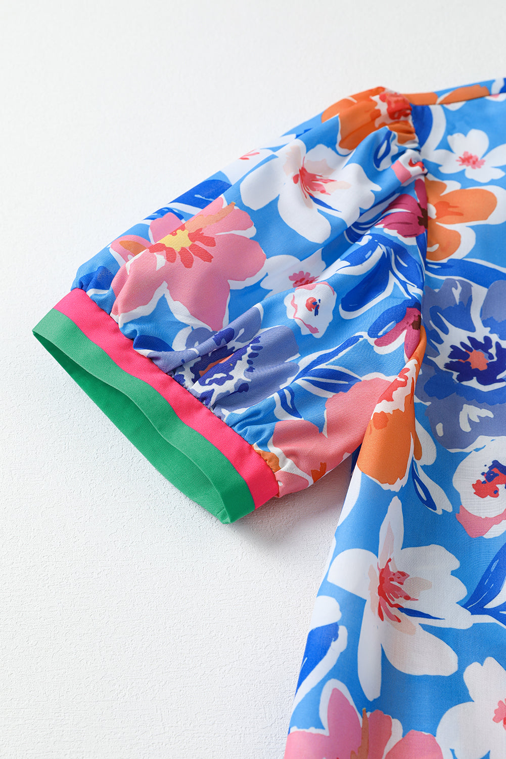Sky Blue Floral Colorblock Edge Puff Sleeve Split Neck Blouse