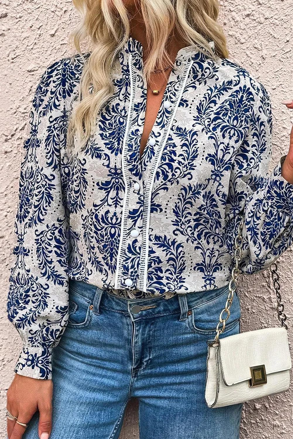 Sky Blue Tribal Pattern Print Notch Neck Buttoned Plus Size Shirt