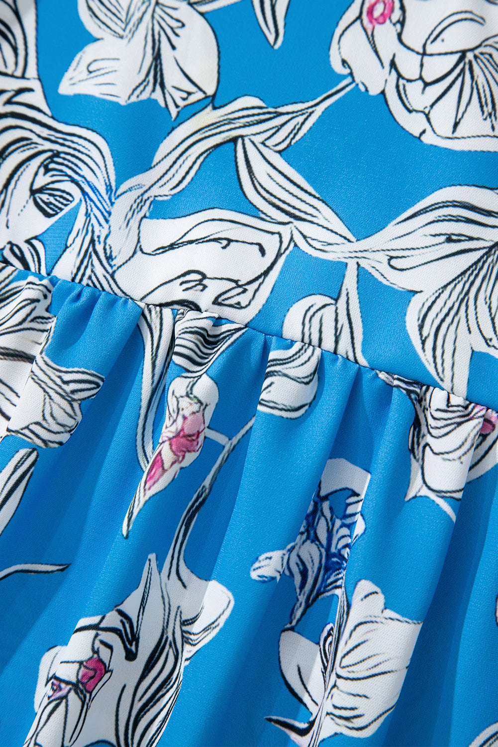 Sky Blue V Neck Floral Print 3/4 Puff Sleeve Blouse
