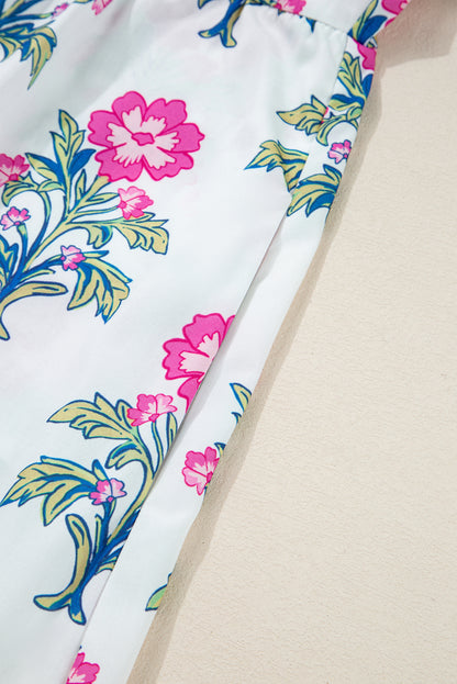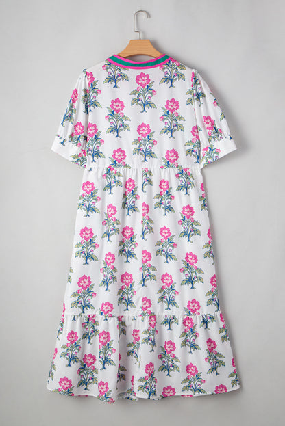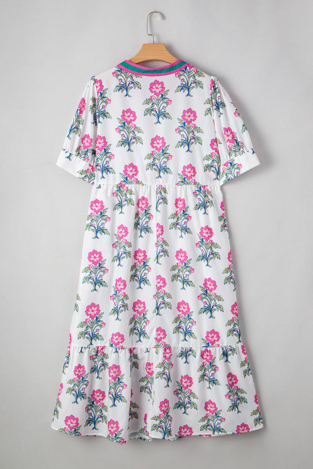White Allover Print Contrast Split Neckline Short Puff Sleeve Curvy Dress