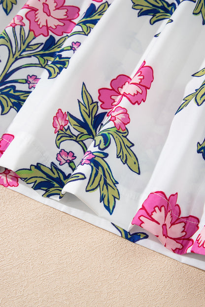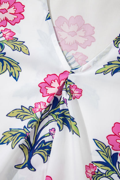 White Floral Colorblock Stripe Knot Bubble Sleeve V Neck Blouse