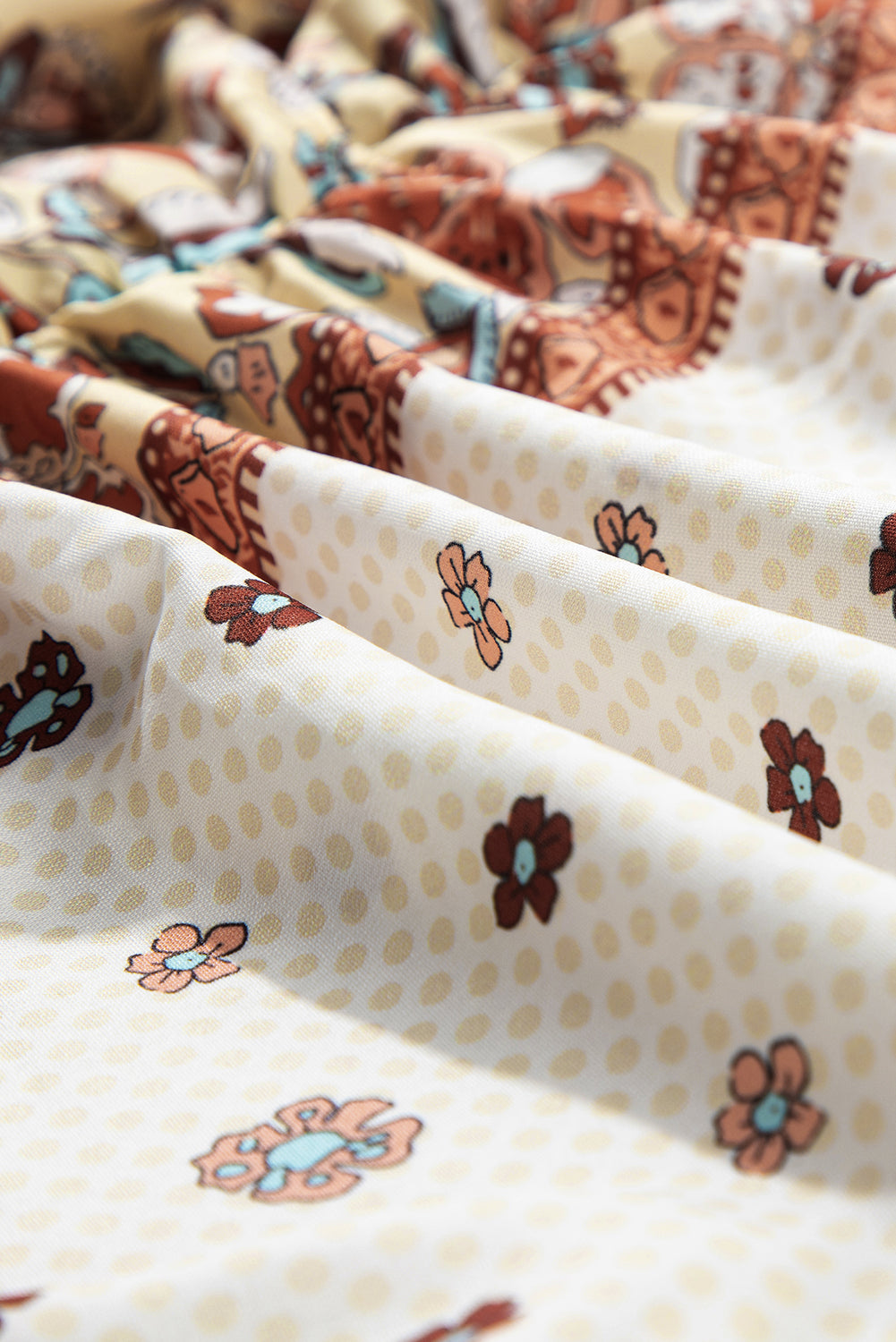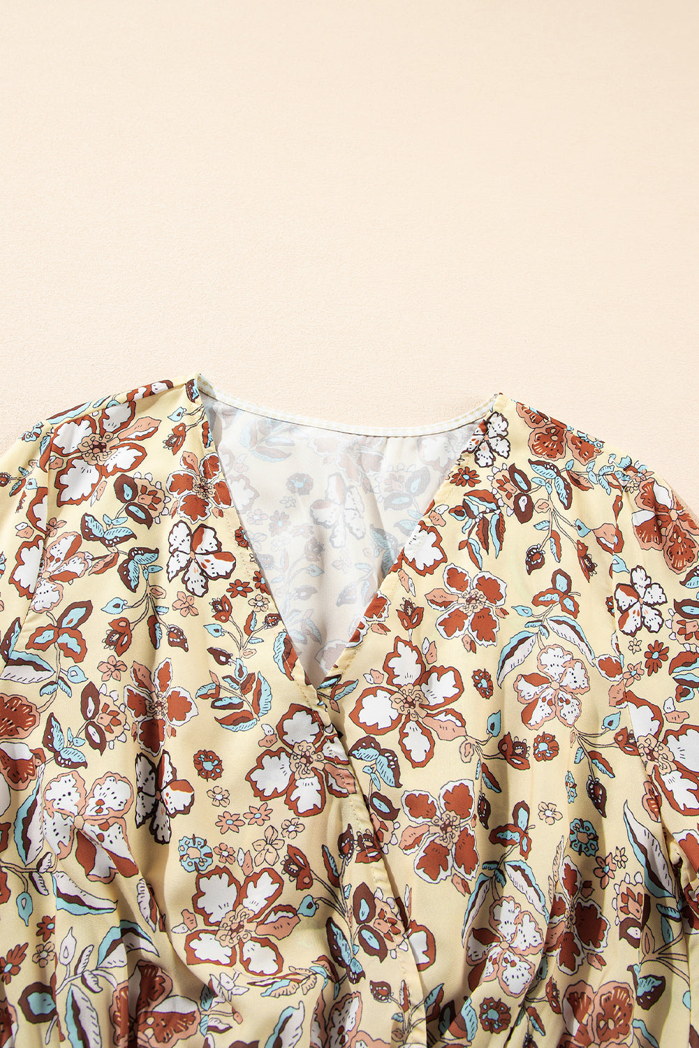 Yellow Printed Floral Bell Sleeve V Neck Wrapped Contrast Peplum Blouse